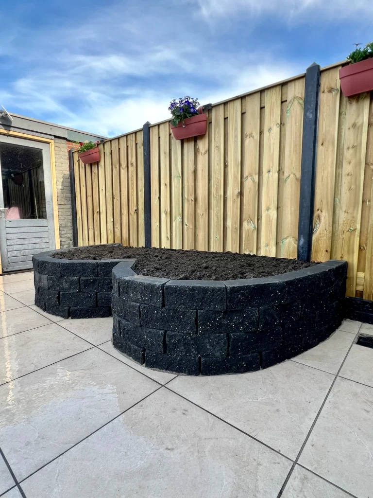 Verhoogde plantenbak met robuuste blokken en ronde vormen