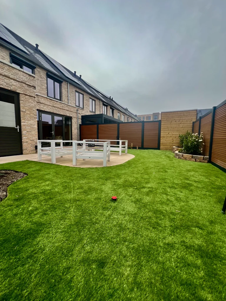 Complete tuin met organische vormen, een groot stuk kunstgras en een schutting van Aluminium/Composiet